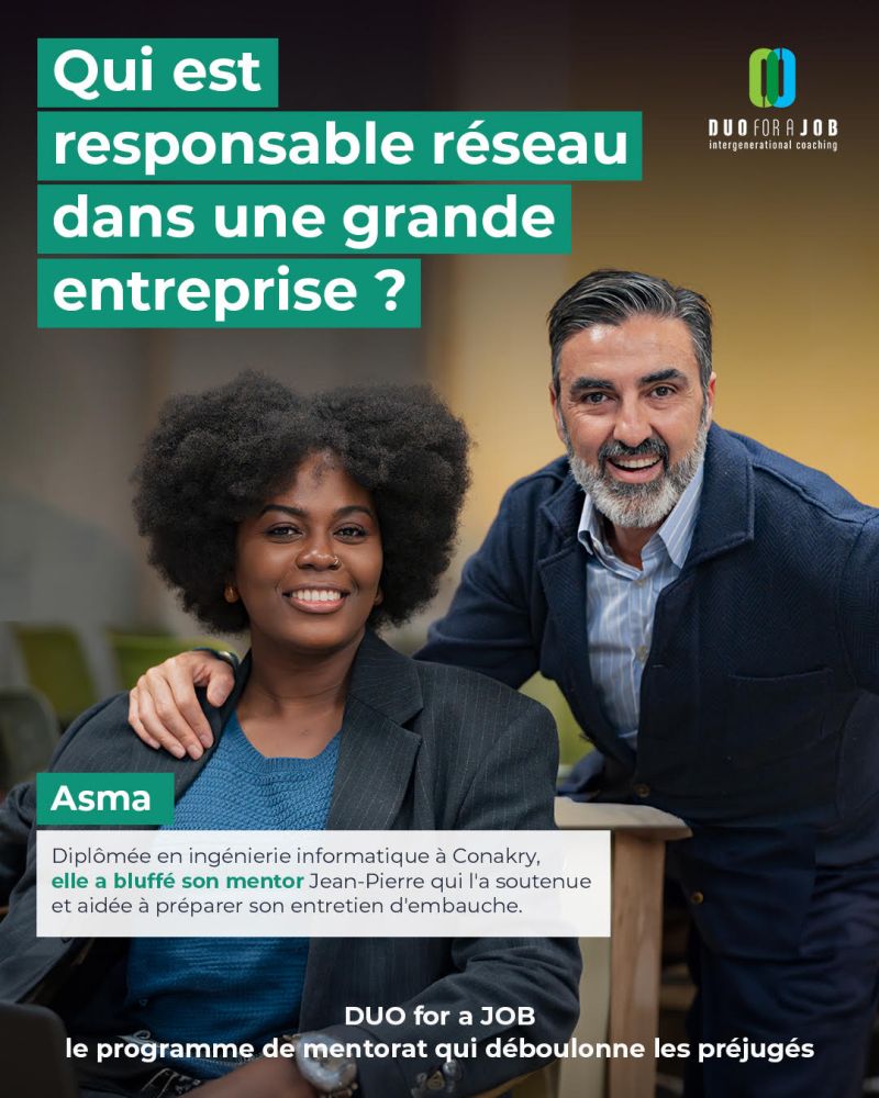 Le mentorat intergénérationnel proposé par DUO for a JOB permet à des bénévoles de plus de 50 ans, les mentors, d’accompagner des jeunes en recherche d’emploi, les mentees, et de booster leurs chances de décrocher un travail. Pour déconstruire les préjugés qui freinent l’insertion des jeunes issus de l’immigration et les personnes de plus de 50 ans, l’association a lancé une campagne de communication percutante sur les réseaux sociaux à travers des portraits de binômes qui cassent les stéréotypes.
